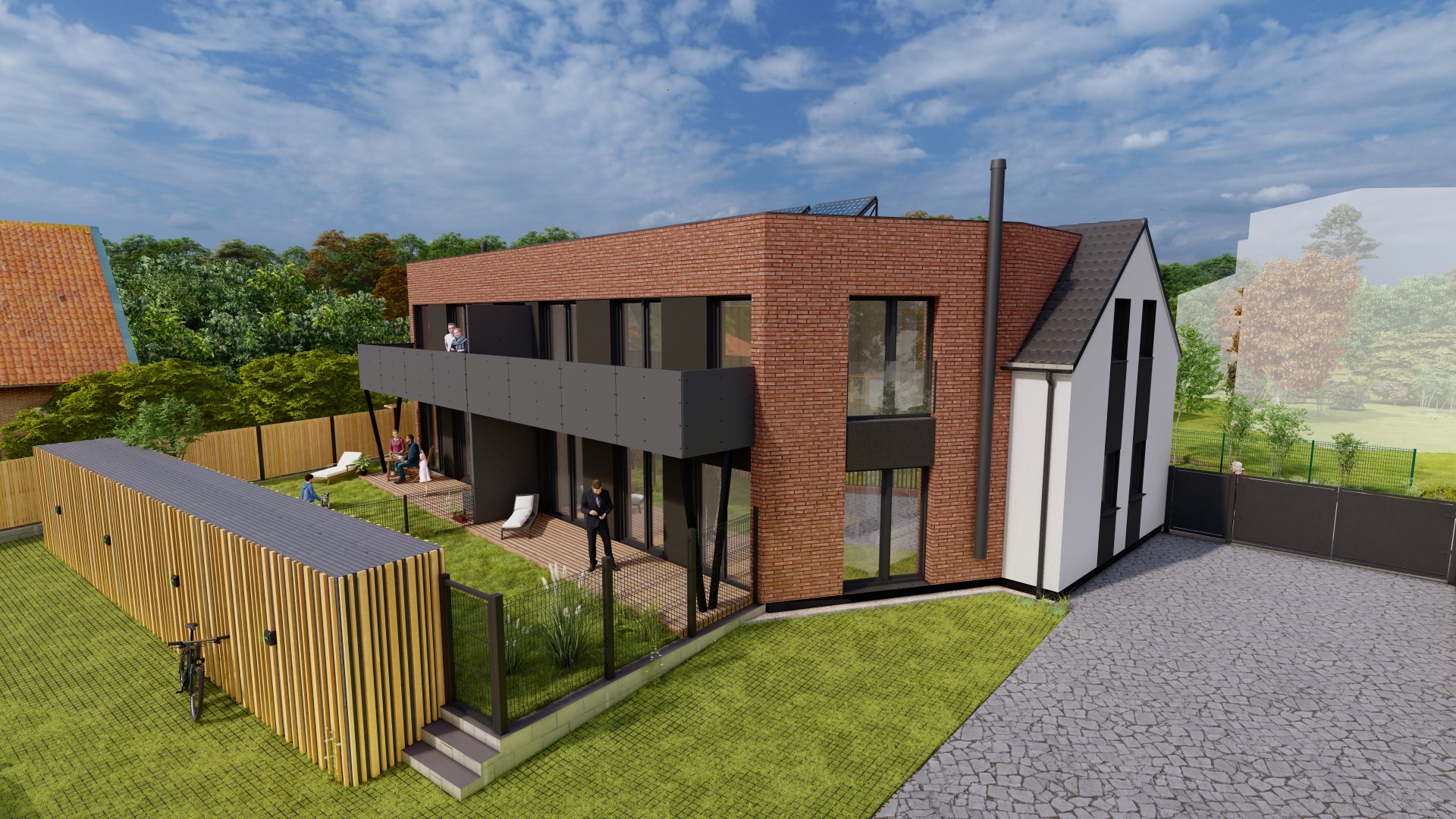 Dům je klasické zděné technologie, energeticky úsporný (třída "B"). Strana domu, která je situována do ulice, prezentuje vzhled klasického venkovského domu. Do zahrad je potom dům koncipován velmi moderně. Punc luxusu dodává cihlový obklad.
