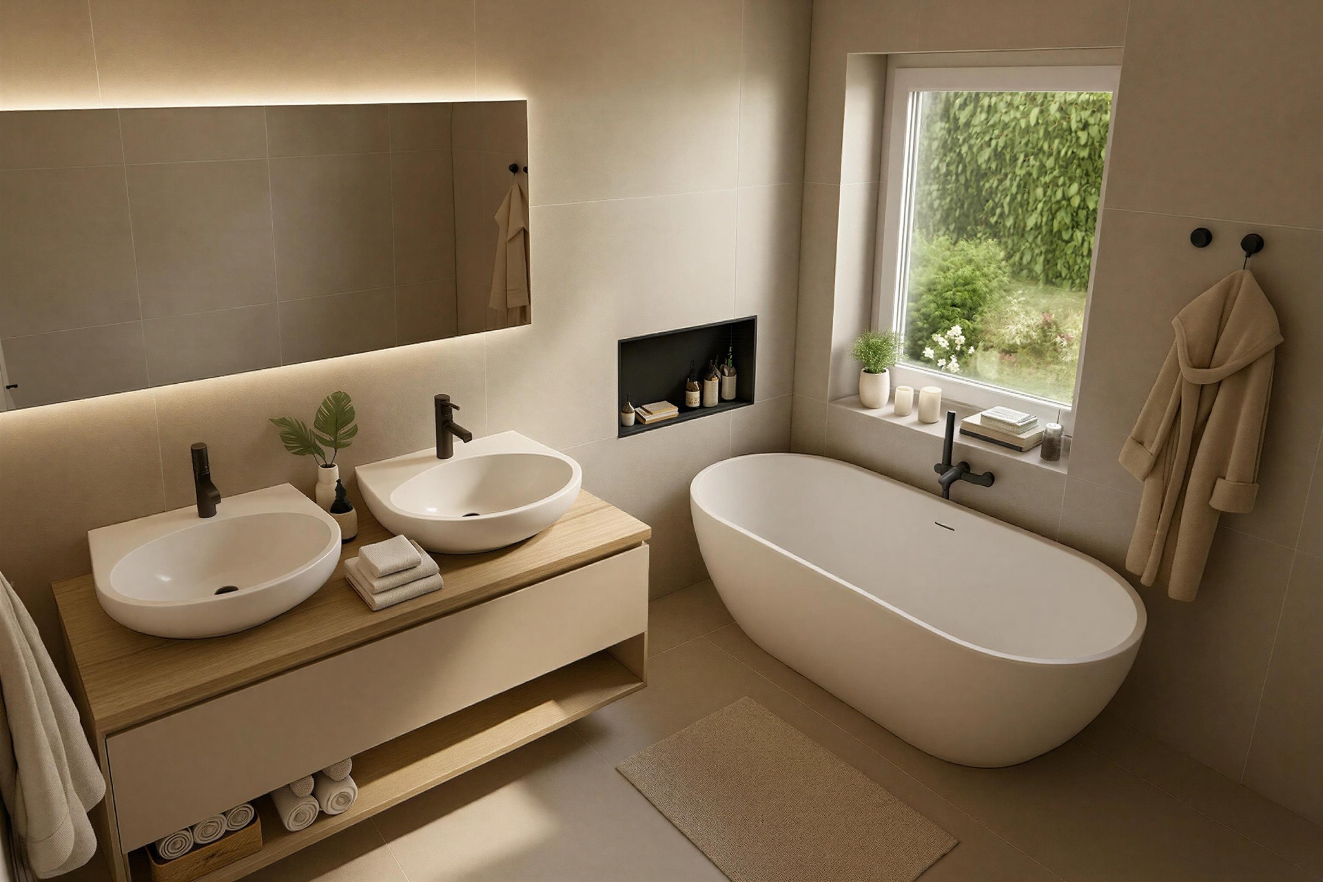 V koupelně naleznete designovou volně stojící vanu (L/P) Time Gemini, dvě umyvadla na desku, sprchový kout, topný žebřík a vodovodní baterie Hansgrohe ze série Vernis Blend v matně černé barvě. WC je řešeno jako samostatné s umyvadlem.